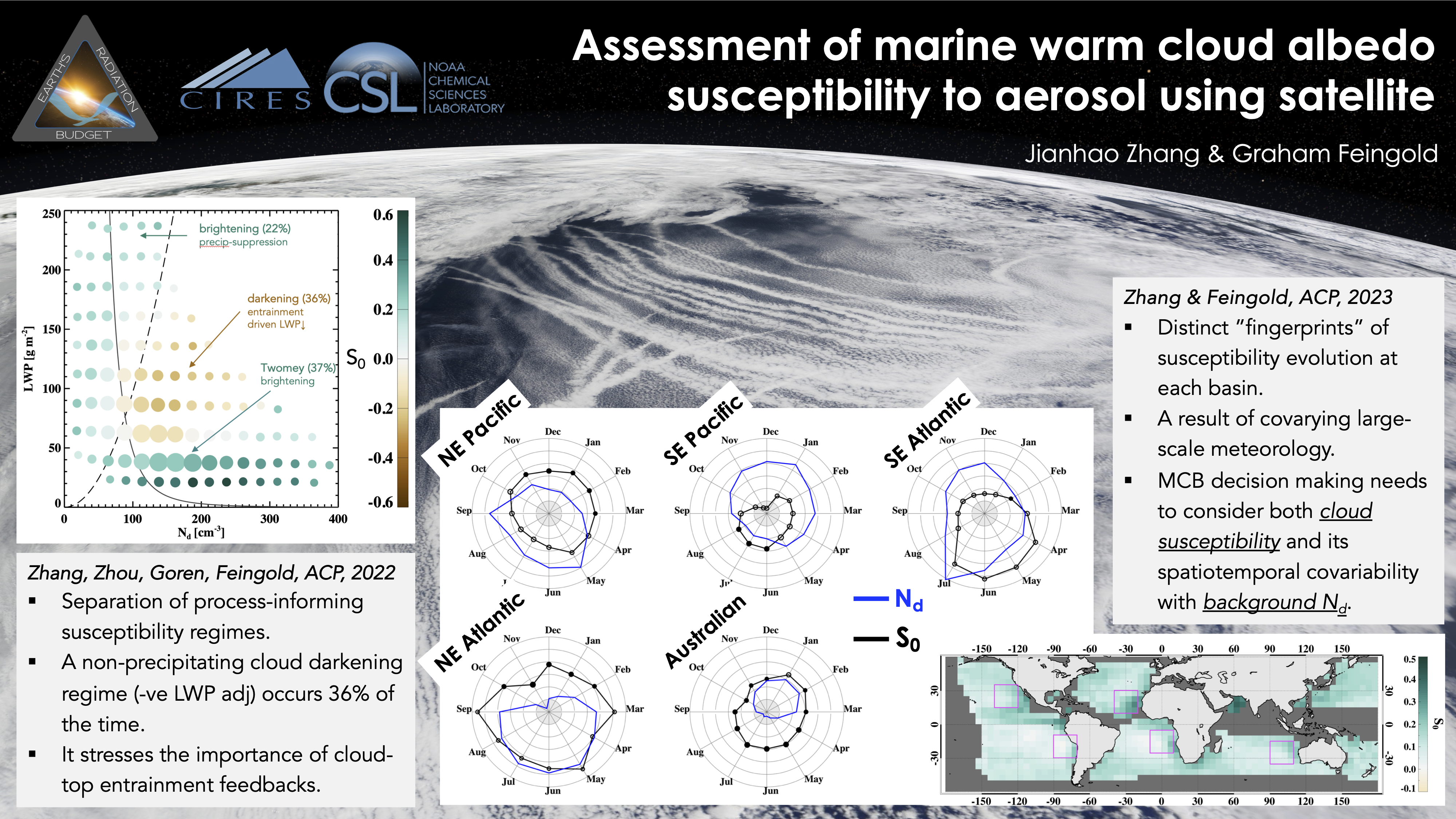 X. Zhou, J. Zhang, and G. Feingold (2021): On the importance of sea surface temperature for aerosol-induced brightening of marine clouds and implications for cloud feedback in a future warmer climate. Geophys. Res. Lett., 48(24), e2021GL095896. doi:10.1029/2021GL095896