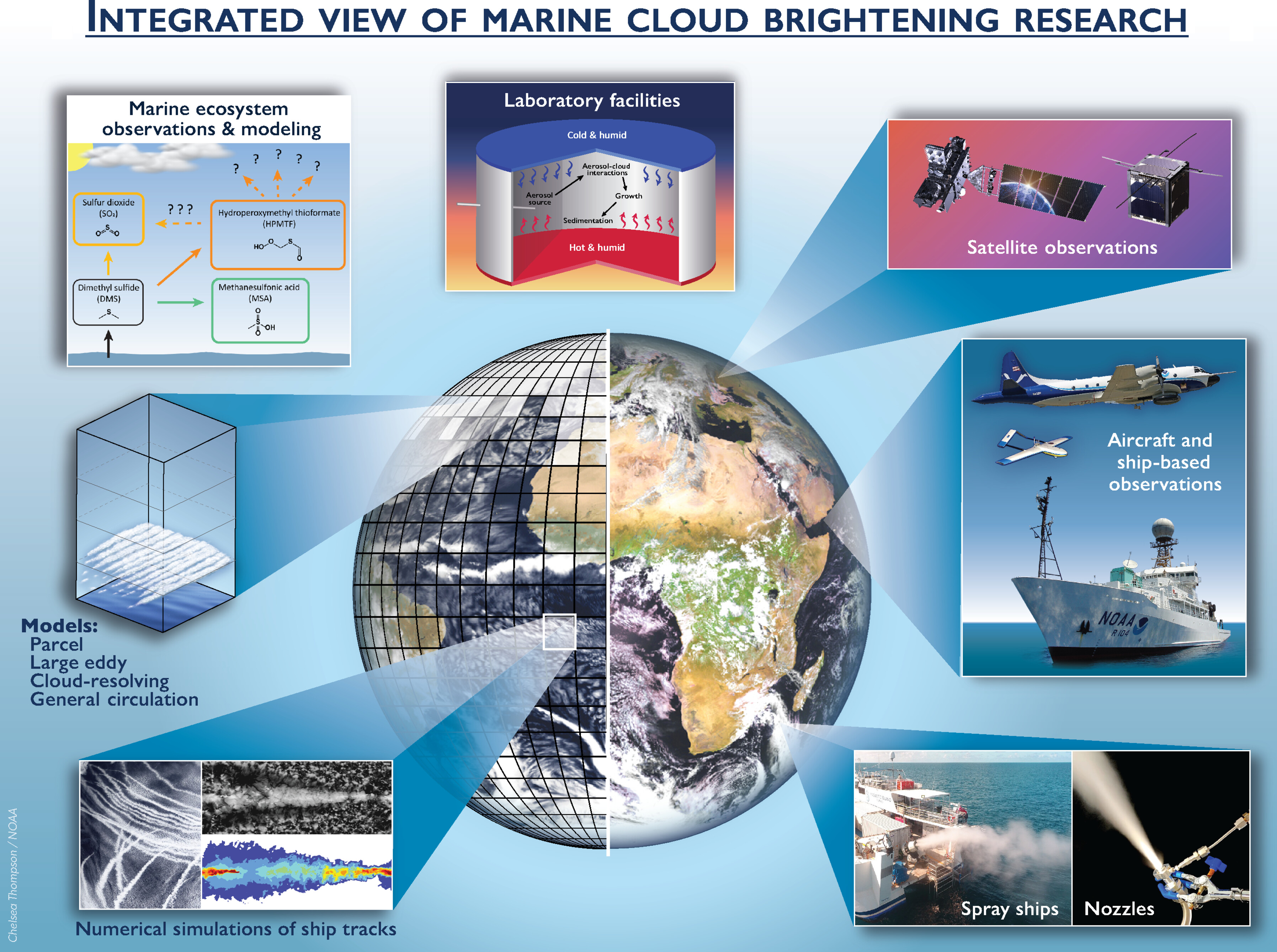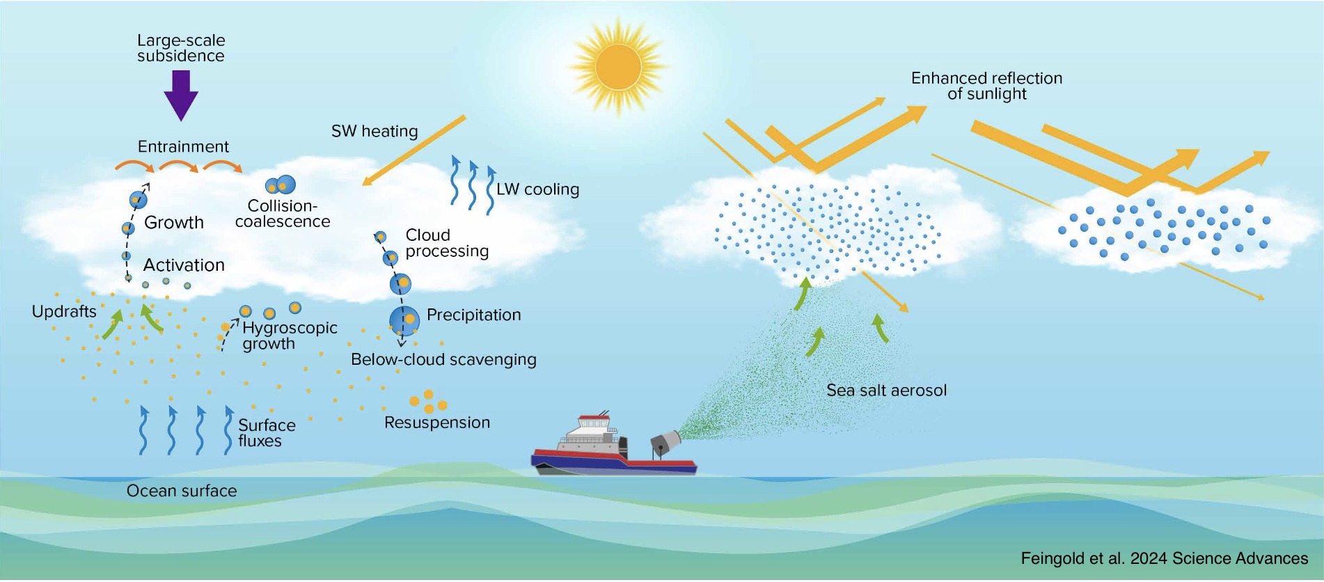 As evidence for severe impacts of global warming continues to accumulate, the possibility of averting the worst effects of climate change through climate intervention (CI) is a topic of increasing scrutiny and debate. The common goal of these CI proposals is to cool the climate by deliberately modifying the solar (shortwave) or terrestrial (longwave) radiation pathways in the Earth’s atmosphere, aiming to reduce the worst impacts of rising global temperatures, in addition to reducing greenhouse gas (GHG) emissions. Marine Cloud Brightening (MCB), one such CI proposal, focuses on enhancing the reflection of solar radiation by warm (liquid containing) marine clouds through the deliberate injection of sea salt particles into these clouds.